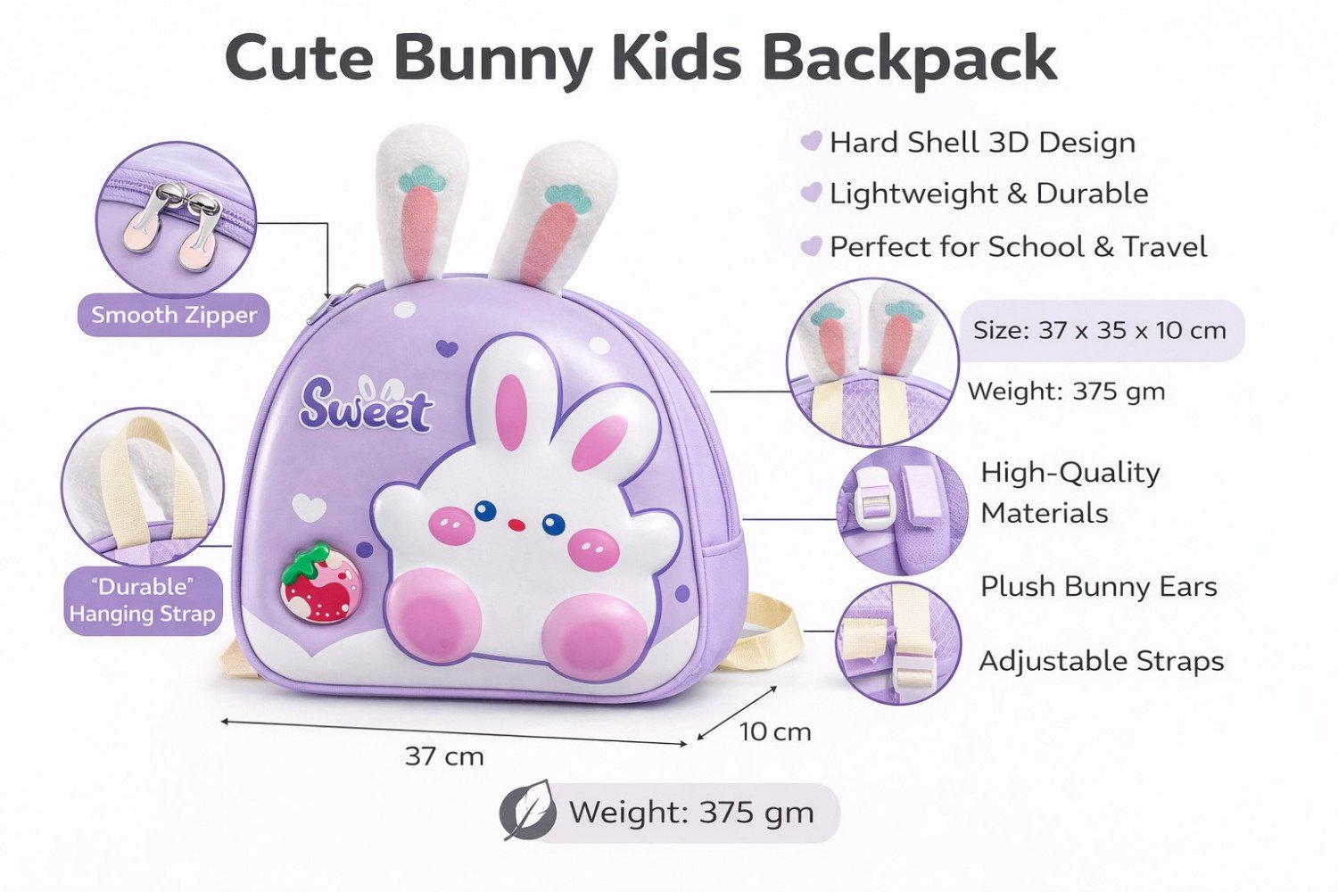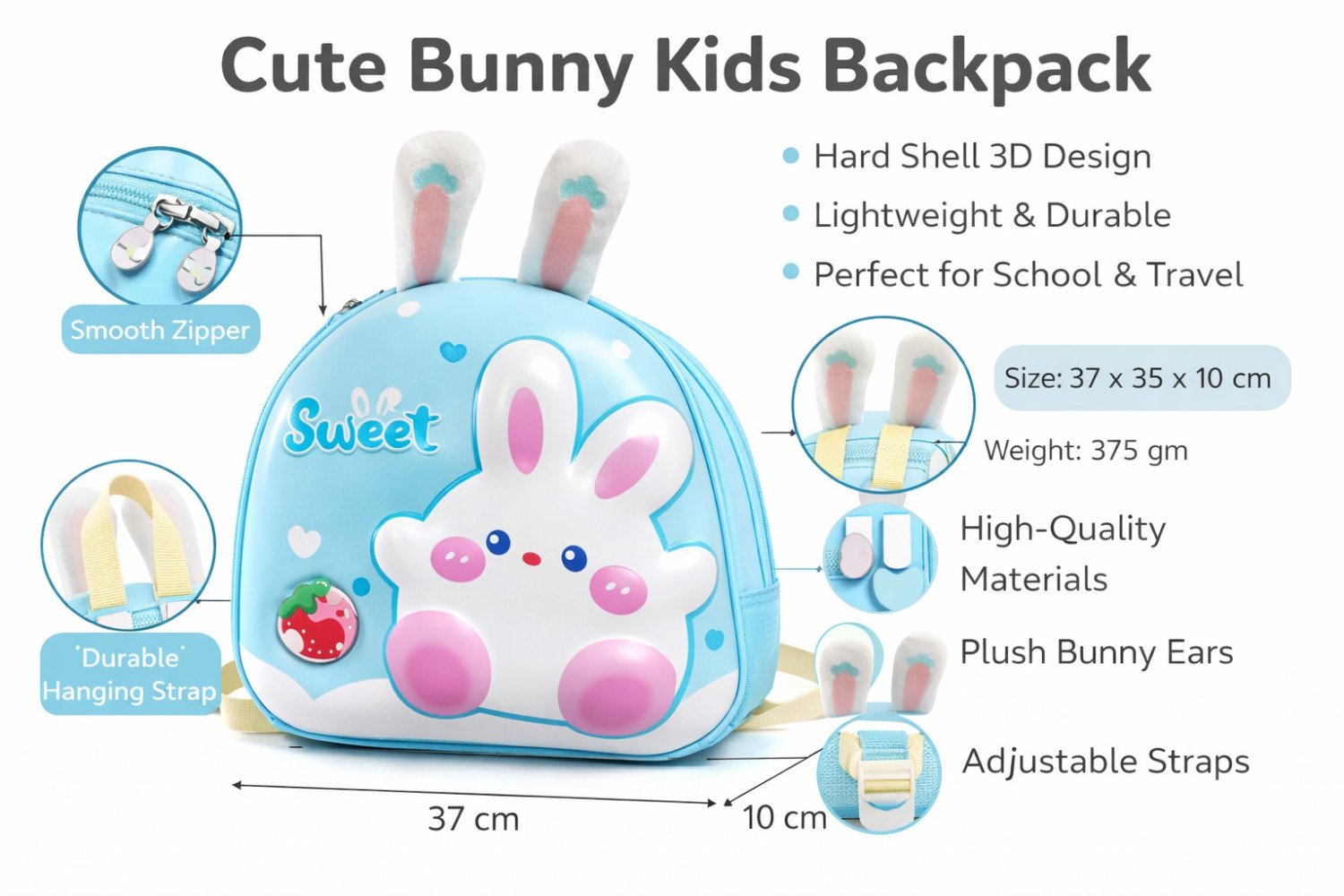 Give your child a backpack that stands out with both style and functionality. The Cute Bunny 3D Hardshell Backpack is the perfect companion for little learners and explorers.
