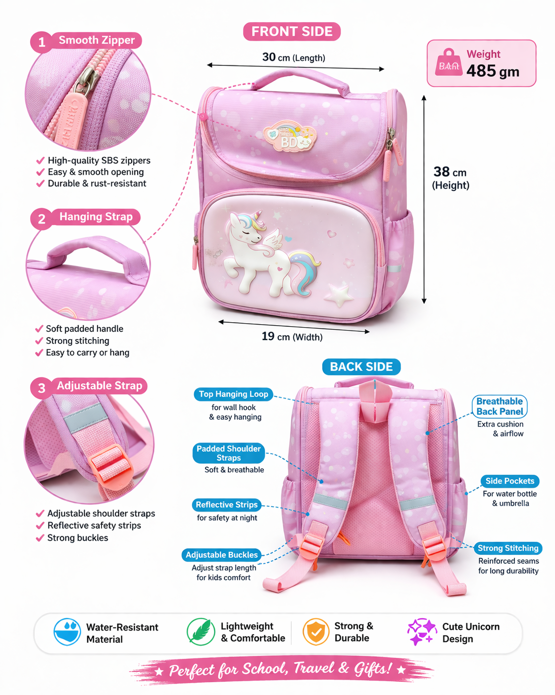 Made from high-quality, lightweight material, this backpack ensures comfort and durability for everyday use. It features a spacious main compartment and a front pocket to keep books, lunch, and essentials neatly organized. The adjustable shoulder straps provide a comfortable fit, making it ideal for school, travel, and outings.